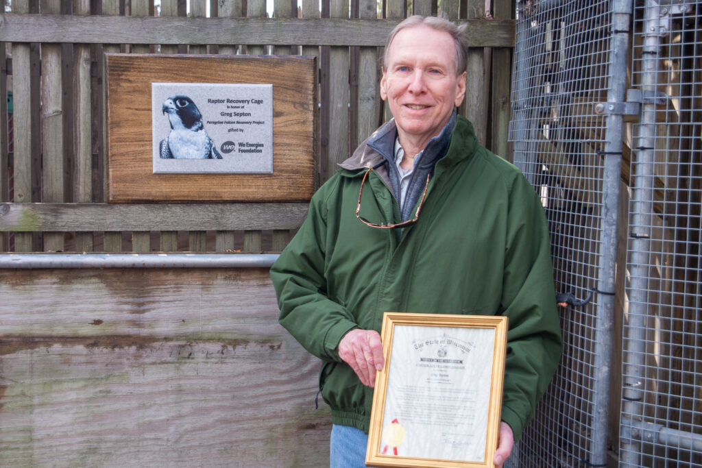 Greg Septon founded Wisconsin’s Peregrine Falcon Recovery Project in 1986. To mark four decades of service, We Energies surprised Septon with a special celebration at the Wisconsin Humane Society’s Wildlife Rehabilitation Center.